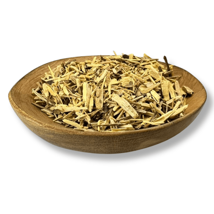Muira Puama (Ptychopetalum olacoides) consists of dried plant material cut into pieces approximately 4–10 mm in size. The material has a natural brown colour with the characteristic woody appearance and texture typical of dried botanical roots and bark.