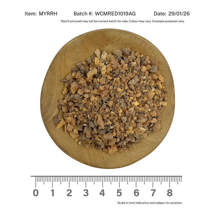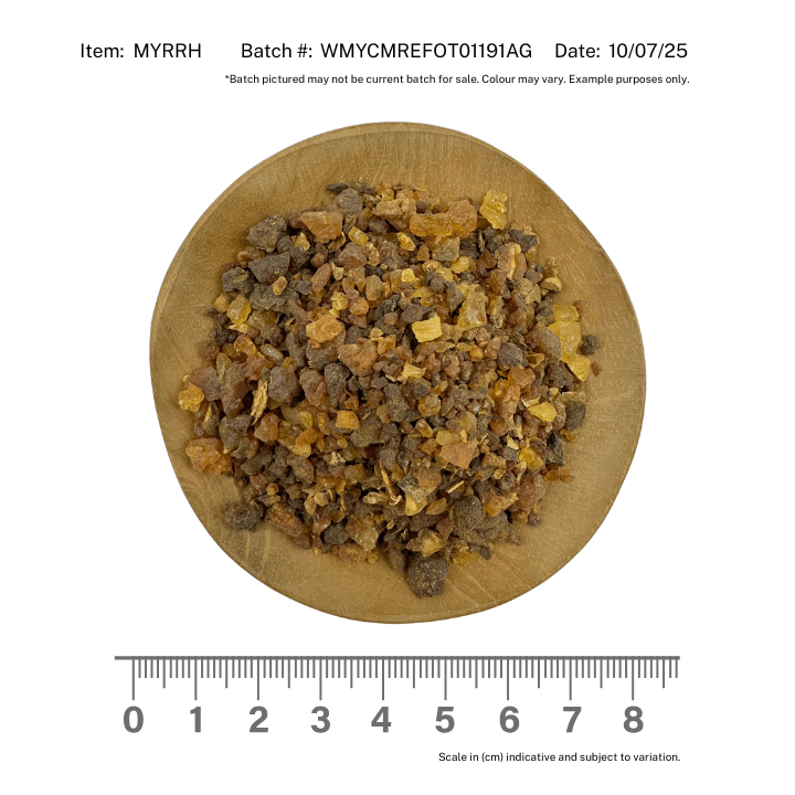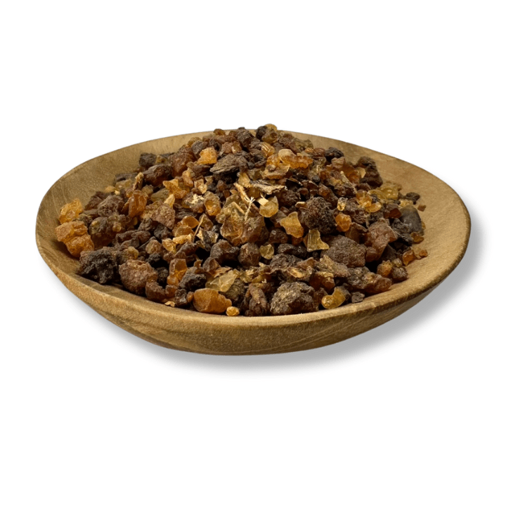 Myrrh Gum (Commiphora spp.) consists of dried resin pieces cut to approximately 4–10 mm. The material has a natural brown colour and a characteristic resinous appearance typical of botanical gums.