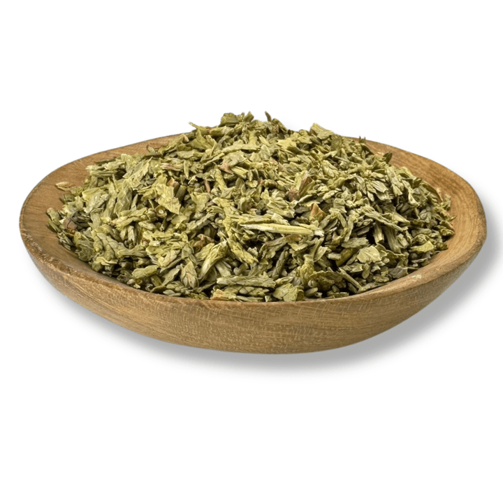 Thuja Herb (Thuja occidentalis) consists of dried aerial parts cut to approximately 4–10 mm. The material displays a natural green to brown-green colour with the characteristic appearance and texture of dried botanical leaf and stem matter.